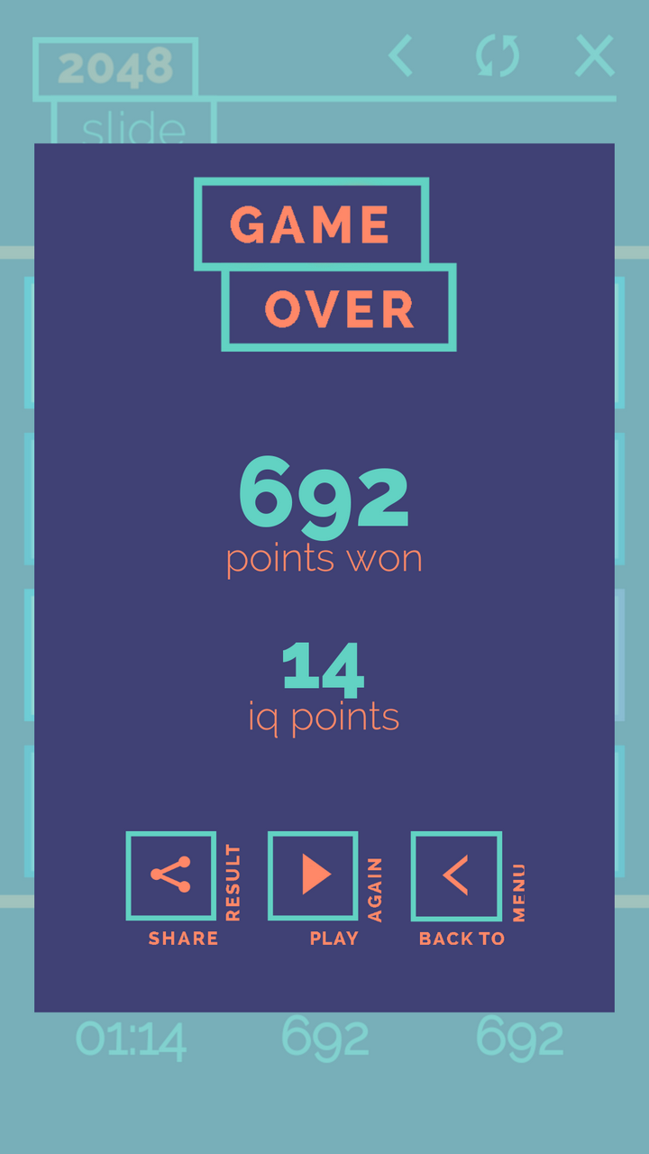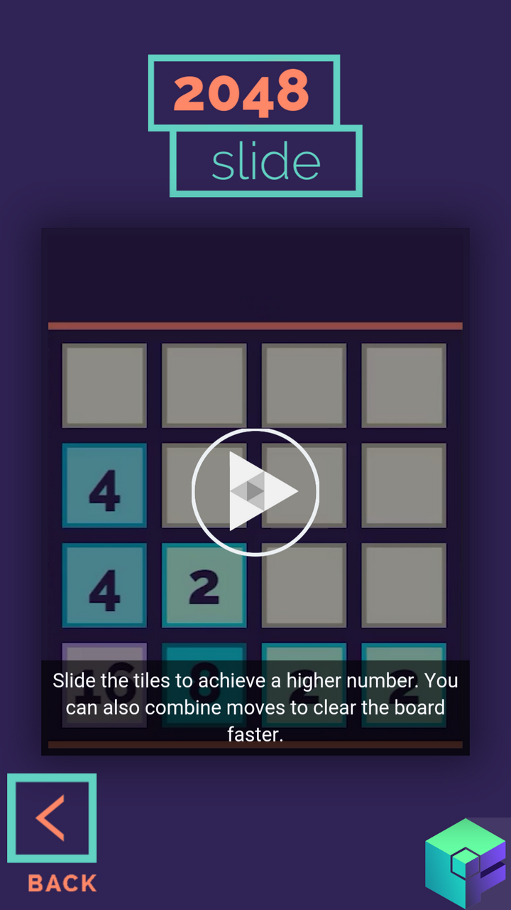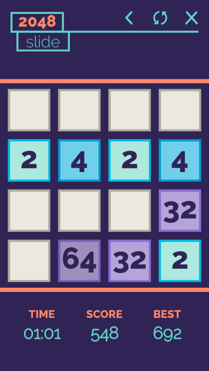 In 2048 Slide you will get the chance to train your brain and prove your tactical and analytical skills in a fun way! All you have to do is to slide the tiles on the board. Pay attention! Plan ahead how to place identical tiles next to each other! When two tiles with the same number touch, they merge into one holding their sum. Like 2 - 4 - 8 ... 1024 - 2048. When the 2048 tile is obtained, you win! In this version of the game can combine moves to clear the board faster.